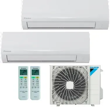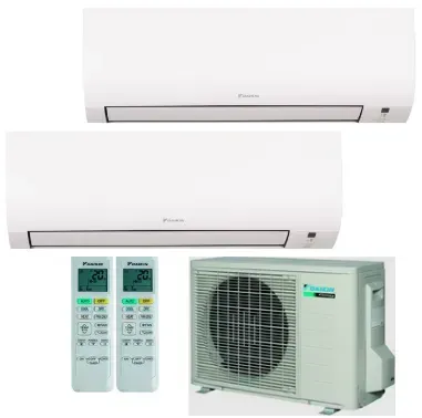 El aire acondicionado 2x1 Daikin Sensira TXF35F - TXF25F combina una unidad exterior con dos unidades interiores de distinta capacidad (una habitación y un salón), ofreciendo una solución versátil y eficiente para climatizar dos espacios de manera independiente.