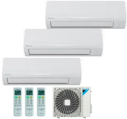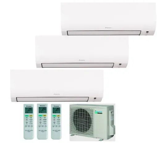 El sistema Daikin Multisplit Comfora TXP25 – TXP25 – TXP35 incluye dos unidades de 2.5 kW y una de 3.5 kW, ideal para climatizar tres habitaciones con una sola unidad exterior, manteniendo independencia de control y alto rendimiento.