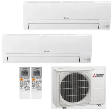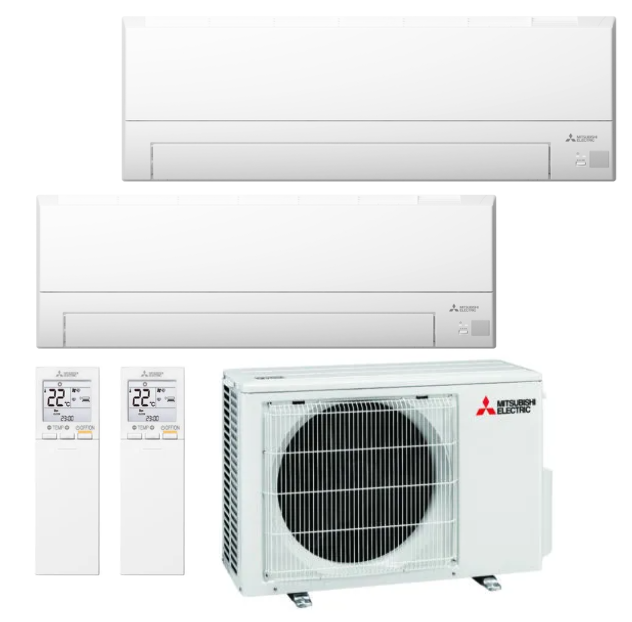 El Aire Acondicionado 2x1 Mitsubishi Electric MSZ-HR WIFI (35 – 25) con unidad exterior MXZ-2HA40VF es un sistema multisplit que permite climatizar dos estancias (1 estancia de hasta 35 m² y otra de hasta 20 m²) con una sola unidad exterior, ideal para ahorrar espacio y consumo.