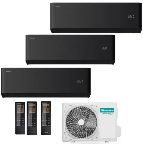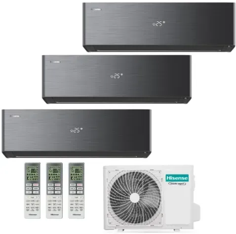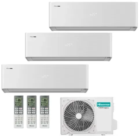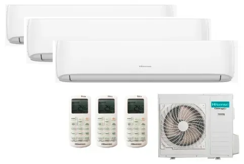 El aire acondicionado 3x1 Hisense Style 35-25-25 es un sistema multisplit compuesto por tres unidades interiores diferentes (1 estancia de hasta 35 m² y 2 estancias de hasta 25 m²) y una unidad exterior, que buscan optimizar el espacio y el consumo energético.