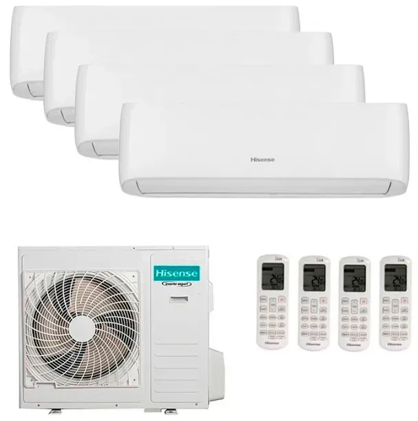 El aire acondicionado 4x1 Hisense Style 35-25-25-25 es un sistema multisplit compuesto por cuatro unidades interiores diferentes (1 estancia de hasta 35 m² y 3 estancias de hasta 25 m²) y una unidad exterior. Esta diseñado para ofrecer máxima eficiencia energética, confort y tecnología avanzada en climatización.