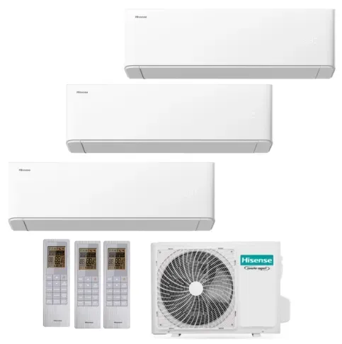 El aire acondicionado 3x1 Hisense Energy Pro X 35-25-25 es un sistema multisplit compuesto por tres unidades interiores diferentes (1 estancia de hasta 35 m² y 2 estancias de hasta 25 m²) y una unidad exterior. Esta diseñado para ofrecer máxima eficiencia energética, confort y tecnología avanzada en climatización.