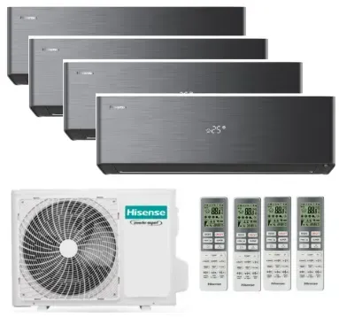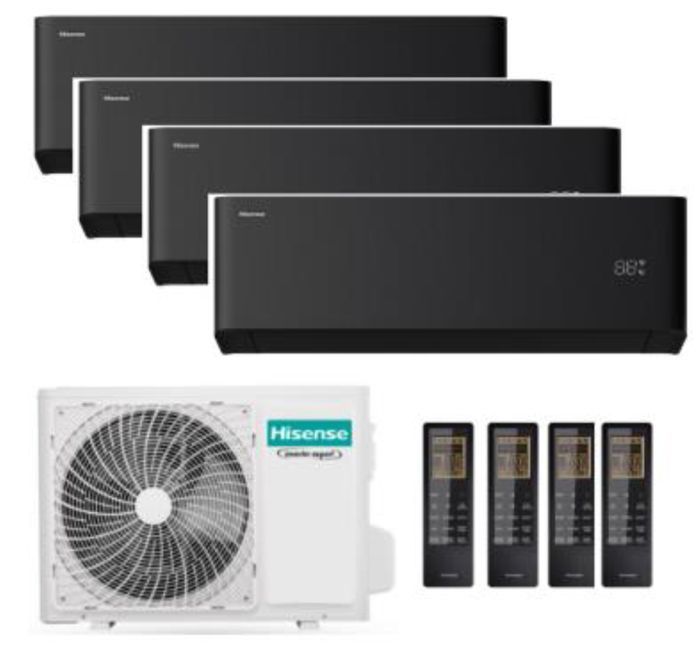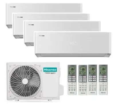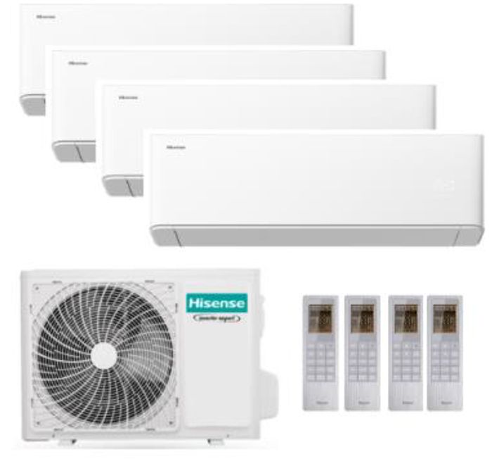 El aire acondicionado 4x1 Hisense Style 35-25-25-25 es un sistema multisplit compuesto por cuatro unidades interiores diferentes (1 estancia de hasta 35 m² y 3 estancias de hasta 25 m²) y una unidad exterior, que buscan optimizar el espacio y el consumo energético.